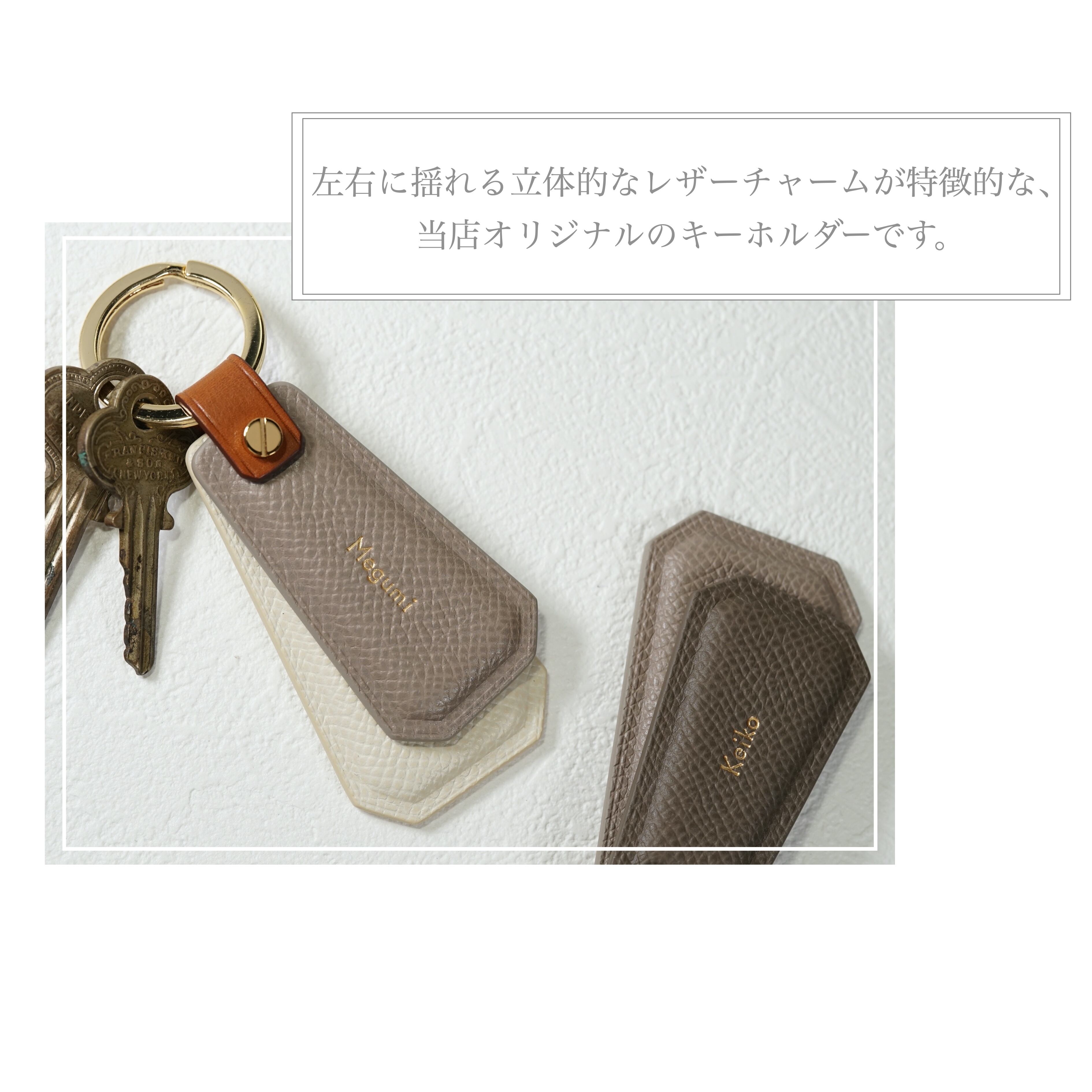 左右に揺れる立体的なレザーチャームが特徴的な、